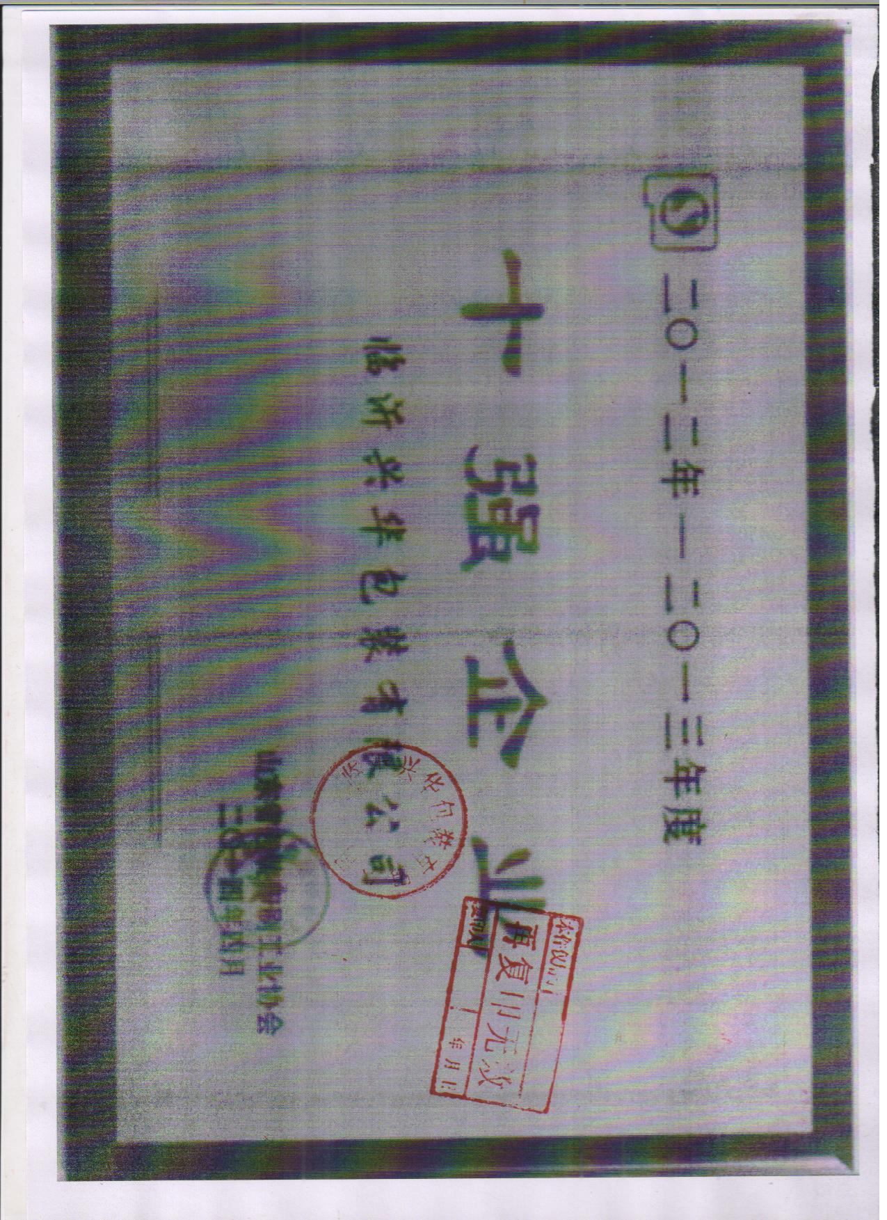 證書(shū)介紹 臨沂興華包裝在2014年4月被山東省包裝印刷工業(yè)協(xié)會(huì)評(píng)為山東省包裝印刷行業(yè)十強(qiáng)企業(yè)