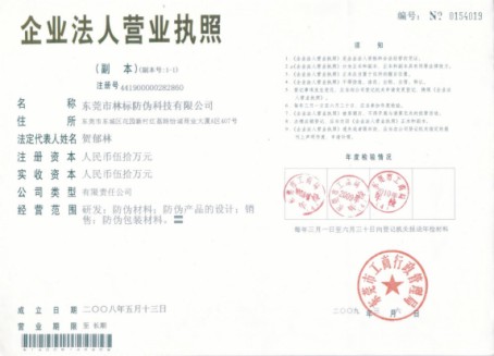 證書介紹 東莞市林標全息防偽有限公司,是專業生產和研發高新防偽科技產品的公司,長期提供鐳射全息防偽印刷產品的最佳服務與最新全息圖像設計,也可跟具客人要求來樣制作并重新設計的一體化服務公司。服務范圍 為客戶提供:鐳射全息圖防偽和電碼查詢防偽兩大類的服務,其服務范圍包括: 最新鐳射圖像產品的設計和按客人原樣翻版制作。電碼查詢防偽產品更具人性化,鐳射材料和電碼防偽產品的膜壓、打膠、模切、分條、印刷、噴碼、版切包裝到出廠,都是在全封閉式無塵車間生產操作,確保客戶防偽產品的最優化。客戶布局 客戶遍布中國內地和東南亞及歐美國家、以前瞻性的策略考量生產研發據點的建立,服務防偽產品開發供應練縮短生產周期且方便材料的供給。服務綜旨 不斷創新的思維,專注鐳射全息防偽產品先進生產設計技術的研發,高素質的研發團隊持續發展先進的防偽技術,滿足客戶對于強化產品功能與降低成本的需求。產品應用 鐳射全息圖產品廣泛適用于:飲料食品、醫藥保健品、玩具、化妝品、五金工具、電子產品、家用電器、化工產品、家居用品、塑料產品、服裝輔料、汽摩及配件、電腦配件、能源、照明用品、紡織皮革、儀器儀表、建筑建材、辦公文教、體育用品、農業產品、禮品工藝品、等.. 主營業務 全息圖、鐳射全息防偽標簽、800電碼查詢防偽商標、OPP透明鐳射防偽膜、鐳射防偽包裝材料、二維三維立體全息防偽圖像制作。 聯系13537088895 商務QQ在線 550848064 http://www.3dhologram.com.cn 證書圖片 |
