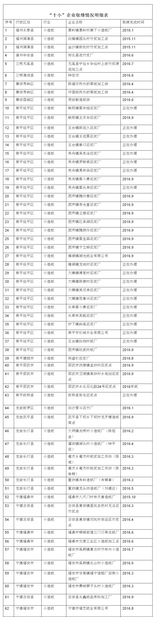 2016年下半年的環保風暴席卷全國,據福建省環境保護廳最新消息,12月30日該省發布《福建省“十小”企業取締清單》,取締不符合政策的造紙廠62家,中國紙箱網小編對照詳細名單為大家做了統計。