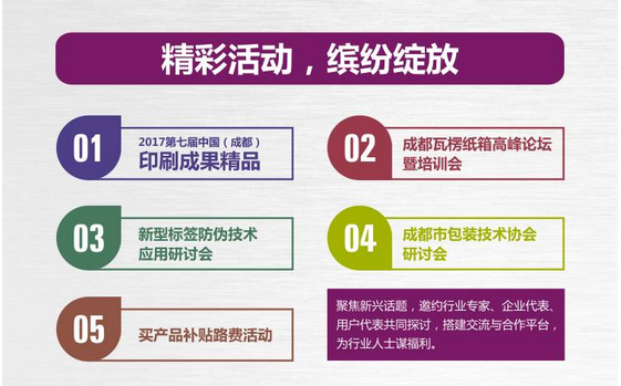 展會同期舉行”2017第七屆中國(成都)印刷成果精品“、”2017成都瓦楞紙箱高峰論壇暨培訓會“、”新型標簽防偽技術應用研討會“、”成都市包裝技術協會研討會“、”買產品補貼路費活動“等活動,聚焦新興話題,邀約行業專家、企業代表、用戶代表共同探討,搭建交流與合作平臺,為行業人士謀福利。