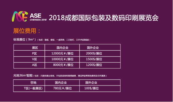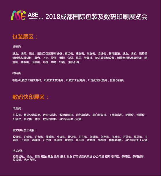 回顧2017成都國際印包展,好評如潮,超過80%的參展商意向參展下屆印包展,現在機會來啦!6月1日組委會將正式進行2018第八屆成都國際包裝及數碼印刷展(ASE CHENGDU 2018)啟動招展、宣傳等各項工作。