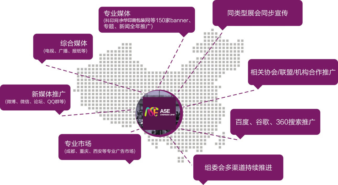 為了吸引更多的業內專業人士、經銷商、采購商和代理商,組委會將會在各個方面加大宣傳力度,包括線上媒體(專業門戶網站)、線下媒體(報紙、報刊等)、新媒體推廣(微博、微信等)、傳統媒體推廣(電視、廣播等)、專業市場廣告投放、同類型展會同步宣傳等多渠道,全面打造ASE CHENGDU 2018的影響力!