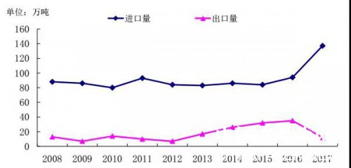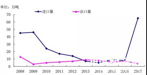 箱紙板:2017年進口量大于出口量,凈進口量125萬噸。