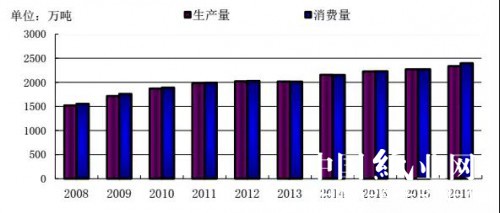 2017年瓦楞原紙生產量2335萬噸,較上年增長2.86%;消費量2396萬噸,較上年增長5.50%。2008——2017年生產量年均增長率4.89%,消費量年均增長率4.94%。