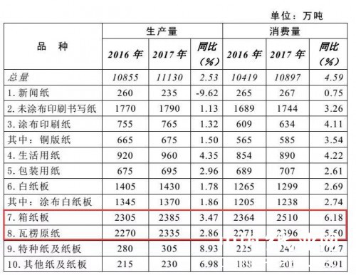全國紙及紙板消費量10897萬噸,較上年增長4.59%。其中箱板紙2510萬噸、同比增長6.18%;瓦楞原紙2396萬噸、同比增長5.50%。