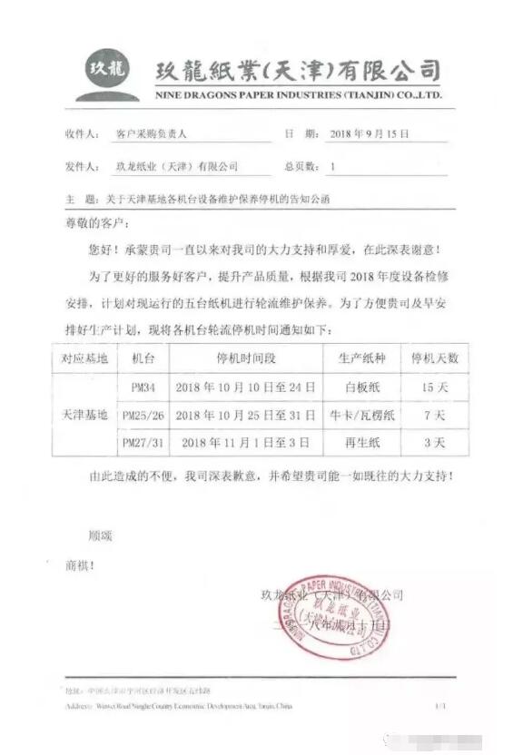 在此前的10月份,天津玖龍進入停機檢修通道:生產(chǎn)白板紙的PM34紙機在2018年10月10日至24日停機15天;生產(chǎn)牛卡/瓦楞紙的PM25/26紙機在2018年10月25日至31日停機7天。