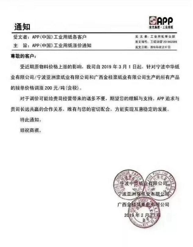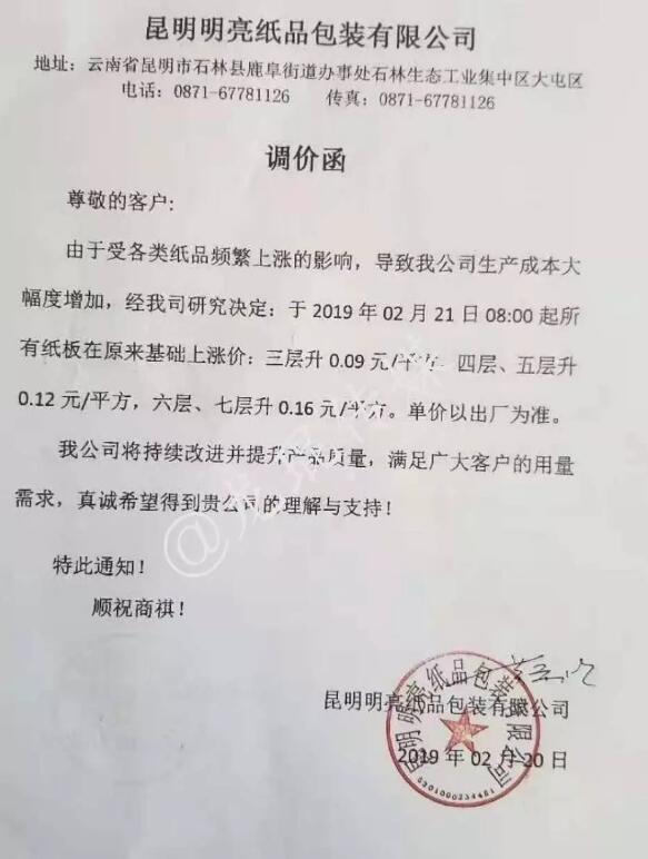 自2019年2月21日8:00起,三層紙板上漲0.09元/平方,四、五層紙板上漲0.12元/平方,六、七層紙板上漲0.16元/平方。