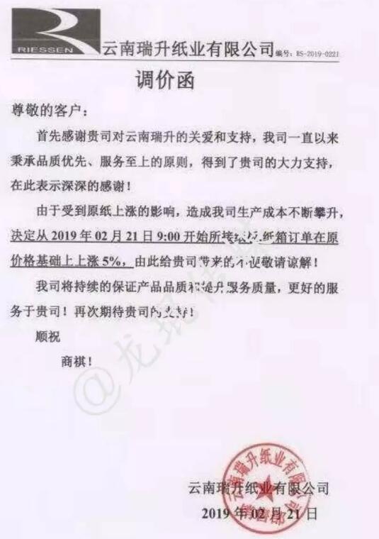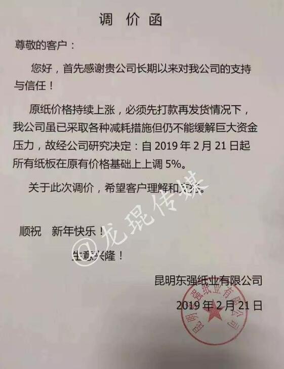 與之類似的還有昆明東強紙業有限公司,其在漲價函中表示:原紙價格持續上漲,必須先打款后發貨情況下,我公司雖采取各種減耗措施但仍不能緩解巨大資金壓力。故決定自2019年2月21日起,所有紙板在原價格基礎上上調5%。