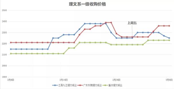 上周理文系一級紙收購價格對比上周五略有上漲。其中東莞理文一級紙在本周上漲了100元/噸,重慶理文上漲了40元/噸,江西理文則與3月1日價格持平。