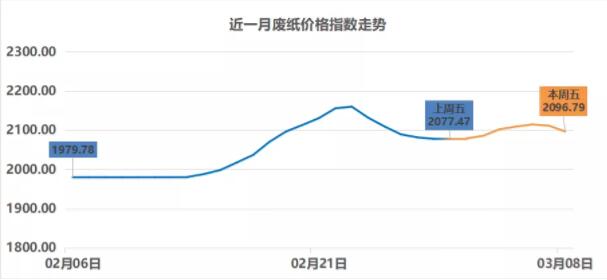 上周廢紙價格指數先漲后跌,但整體來說走勢相對較為平緩,廢紙價格單次漲跌幅度多在50元/噸之內。截止03月08日,廢紙價格指數從最高值回落至2096.79點。