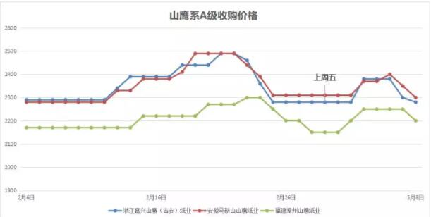 上周山鷹系A級廢紙收購價格略有波動,但對比3月1日收購價格,其變化并不算太大。截止3月8日浙江山鷹與上周五價格持平,安徽山鷹下跌了10元/噸,福建山鷹則上漲了50元/噸。