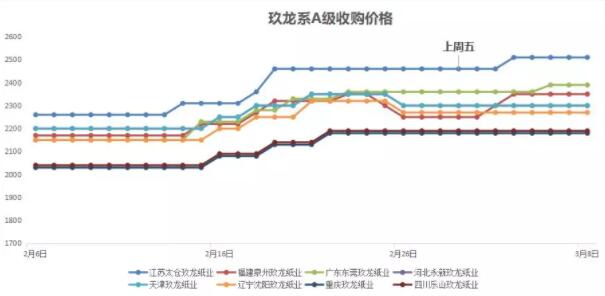 截止3月8日,玖龍系A級以江蘇太倉玖龍最高,為2510元/噸;重慶玖龍最低,為2180元/噸。
