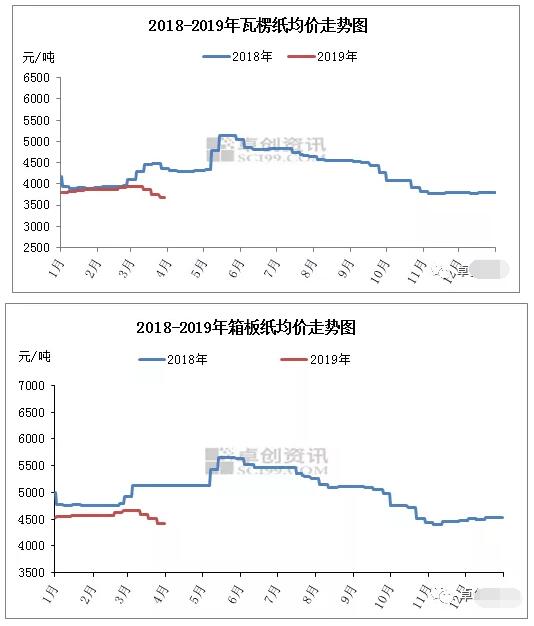 2019年以來,國內(nèi)瓦楞及箱板紙市場價格呈現(xiàn)先漲后降走勢,1-2月份紙價震蕩上揚(yáng)為主,首先因原料廢紙價格上漲,成本增加支撐下紙企漲價意愿強(qiáng)烈。其次春節(jié)期間停機(jī)檢修紙企較多,市場供應(yīng)略顯緊張。另外正處春節(jié)前后下游備貨旺季,市場需求表現(xiàn)尚可。而3月份以后隨著新增產(chǎn)能投放以及需求的轉(zhuǎn)淡,市場供需矛盾有所加劇,紙價開始進(jìn)入下行通道。據(jù)卓創(chuàng)資訊統(tǒng)計數(shù)據(jù)顯示,截至3月27日,2019年3月全國瓦楞紙月均價在3833元/噸,環(huán)比下滑1.58%,同比下跌12.43%;全國箱板紙月均價在4567元/噸,環(huán)比下滑1.05%,同比下滑10.64%。