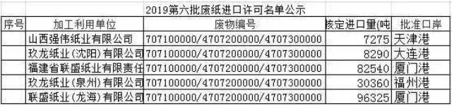 與第5批外廢進口公示相比,本次外廢進口審批額度在核準廢紙總量、企業(yè)數(shù)量都呈現(xiàn)暴跌趨勢。本次外廢審批有5家造紙廠獲批,包括山西強偉紙業(yè)(7275噸)、沈陽玖龍(8290噸)、泉州玖龍(30360噸)、福建聯(lián)盛(82530噸)以及聯(lián)盛龍海(96325噸)。
