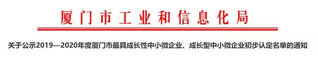 2019—2020年度廈門市成長型中小微企業考核認定活動于2018年10月正式啟動,通過申報、初審、專家評審等環節初選出“2019—2020年度廈門市最具成長性中小微企業”72家、“2019—2020年度廈門市成長型中小微企業”528家,現予以公示并面向社會各界征求意見,公示期2019年5月8日至2019年5月14日。