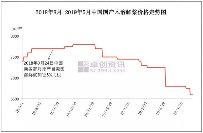 中國對溶解漿進(jìn)口依賴度較大,2018年中國溶解漿進(jìn)口量283.84萬噸,出口量0.21萬噸,所以我們主要分析這次事件對進(jìn)口溶解漿市場的影響。對原產(chǎn)自美國的溶解漿維持2018年9月加征的5%關(guān)稅,根據(jù)上圖顯示,對比2017年和2018年溶解漿分國家占比,美國占比穩(wěn)定在11%以上,并沒有因?yàn)?018年8月加征關(guān)稅而出現(xiàn)明顯下降。從價格走勢圖看,2018年9月24日后溶解漿價格并沒有明顯震蕩。卓創(chuàng)分析,這次對美國進(jìn)口溶解漿維持2018年稅率,對漿市直接影響不明顯,需求面仍是影響漿價走勢的主要因素。