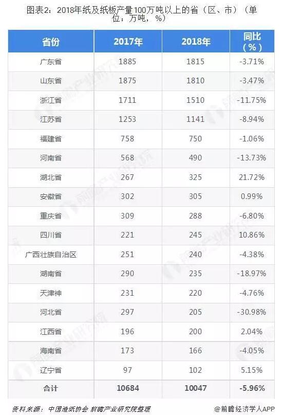 而在省份格局上,廣東、山東以及浙江為主要產(chǎn)區(qū)。2018年廣東、山東、浙江、江蘇、福建、河南、湖北、安徽、重慶、四川、廣西、湖南、天津、河北、江西、海南和遼寧17個(gè)省(區(qū)、市)紙及紙板產(chǎn)量超過100萬噸,產(chǎn)量合計(jì)10047萬噸,占全國(guó)紙及紙板總產(chǎn)量的96.28%。