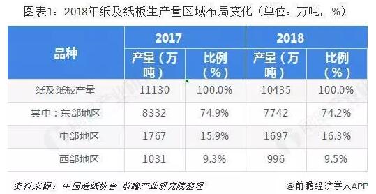根據(jù)中國(guó)造紙協(xié)會(huì)調(diào)查資料,2018年我國(guó)東部地區(qū)11個(gè)省(區(qū)、市),紙及紙板產(chǎn)量占全國(guó)紙及紙板產(chǎn)量比例為74.2%;中部地區(qū)8個(gè)省(區(qū))比例占16.3%;西部地區(qū)12個(gè)省(區(qū)、市)比例占9.5%。