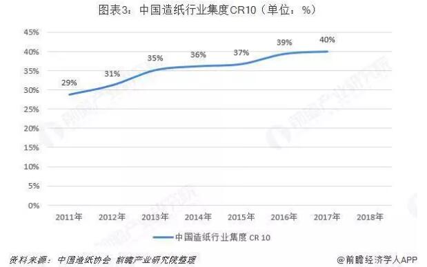 從行業(yè)整體的產(chǎn)銷量數(shù)據(jù)來看,經(jīng)過2010年以來的環(huán)保政策去產(chǎn)能之后,造紙行業(yè)的CR10從2011年的28.70%逐步上升到2017年的39.95%,而美國(guó)造紙行業(yè)在經(jīng)歷環(huán)保立法去產(chǎn)能及行業(yè)并購之后,CR10已經(jīng)達(dá)到了90%左右。