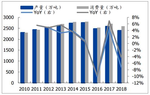 2006-2018年中國包裝紙消費量和產量數據走勢圖(單位:萬噸)
