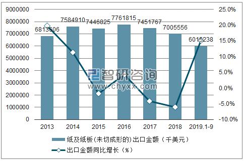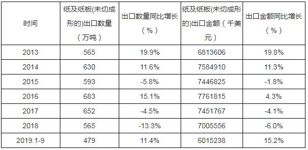 2013-2019年9月中國紙及紙板(未切成形的)出口數(shù)量及出口金額統(tǒng)計(jì)表