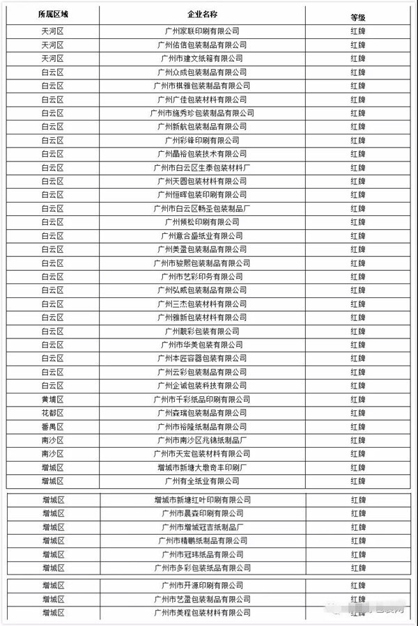11月15日,廣州市生態環境局公示了2018年度市級企業環境信用評價結果,共有2928家企業納入評價范圍。其中,43家包裝印刷類企業被評為環保不良企業(紅牌企業)。