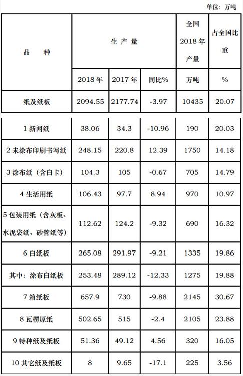 (2018年廣東省包裝紙及紙板主要紙種產量)