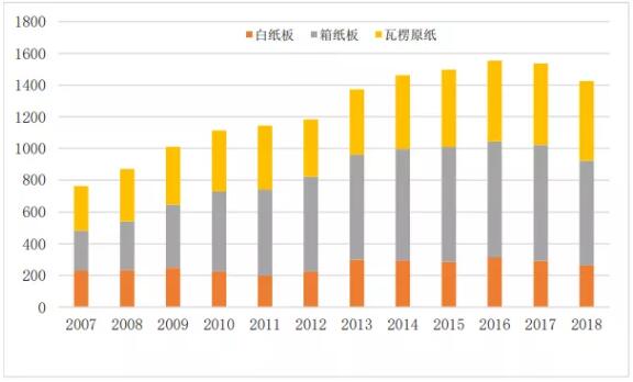 其中箱紙板產量為657.9萬噸,同比下降9.9%;瓦楞原紙產量為502.65萬噸,同比下降2.4%;白紙板產量為265.08萬噸,同比下降9.2%;灰板紙產量99.2萬噸,同比下降4.8%。可見,各種不同種類的包裝紙產量均出現明顯下降。