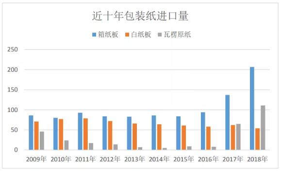 同時,不少包裝印刷企業為了降低成本,從國外采購包裝紙原紙。2017年-2018年,包裝紙進口量大幅增長,2018年,全國進口箱紙板207萬噸,同比增長51.1%;進口瓦楞原紙111萬噸,同比增長70.8%。2019年1-6 月,全國進口瓦楞原紙64萬噸,同比增長52%。
