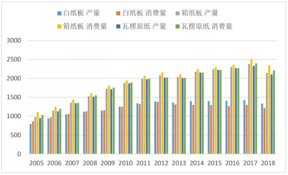 2018年全國包裝紙產銷量同比2017年均有大幅下降,其中,箱紙板產量為2145萬噸,同比下降10.06%,消費量2345萬噸,同比下降6.57%;瓦楞原紙產量2105萬噸,同比下降9.85%,消費量2213萬噸,同比下降7.64%;白紙板產量1335萬噸,同比下降6.64%,消費量1219萬噸,同比下降6.16%。