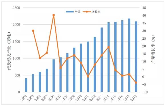 2018年,全國紙及紙板產量達10435萬噸,同比下降6.24%。其中,廣東省紙及紙板產量 2094.55萬噸,同比下降3.9%,占全國紙及紙板產量20.1%。全國和廣東省紙及紙板產量雙雙出現下滑,這也是近十年來從未出現的現象。