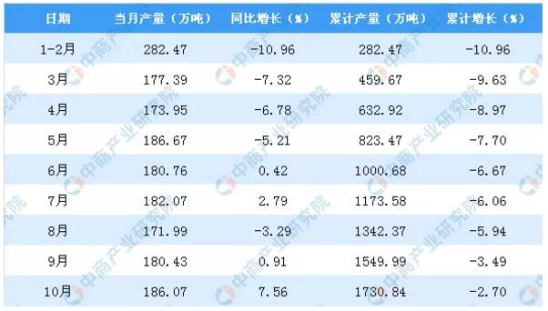 2019年1-3季度山東省機(jī)制紙及紙板產(chǎn)量波動(dòng)幅度不大,2019年10月山東省機(jī)制紙及紙板產(chǎn)量為186.07萬噸,同比增長(zhǎng)7.56%。2019年1-10月山東省機(jī)制紙及紙板產(chǎn)量為1730.84萬噸,同比下降2.7%。