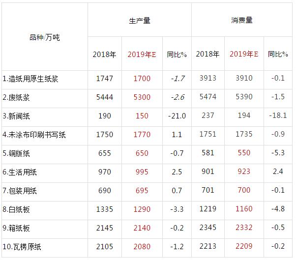 根據(jù)上述數(shù)據(jù)和分析,我們預計2019年全年國內制漿和造紙生產(chǎn)量和消費量為: