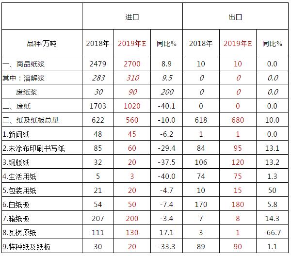 根據(jù)紙漿造紙行業(yè)2019年前9個月的生產(chǎn)、銷售和進出口數(shù)據(jù),以及對今年后續(xù)生產(chǎn)、市場需求及進出口情況的調研,我們預計全年紙漿、廢紙和紙及紙板進出口、生產(chǎn)與消費情況如下: