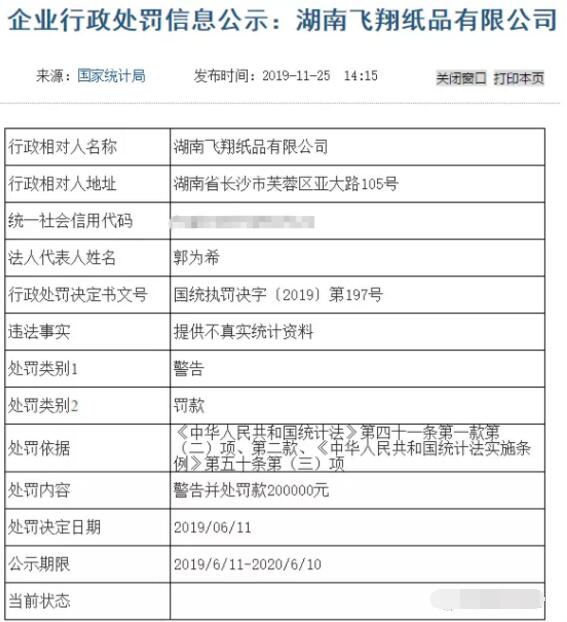 近日,國家統計局公示了一則行政處罰信息:湖南飛翔紙品有限公司因提供不真實統計資料而違反相關法律,被警告并處罰款20萬元。該企業于6月11日被作出處罰決定,將在國家統計局網站上公示一年。