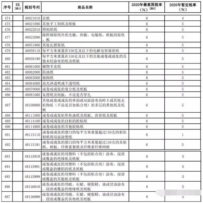 稅則號為48051900的其他瓦楞原紙,2020年最惠國稅率為6%,2020年暫定稅率為5%;