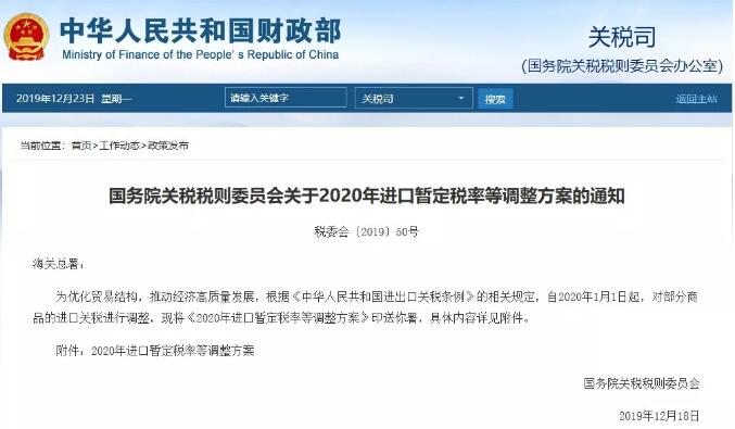 公告顯示,為積極擴大進口,激發進口潛力,優化進口結構,自2020年1月1日起,我國將對850余項商品實施低于最惠國稅率的進口暫定稅率。其中: