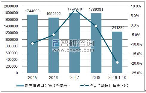 2015-2019年1-10月中國涂布紙進口金額及增速趨勢圖