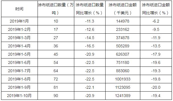 2019年1-10月中國涂布紙進口數量及進口金額統計表