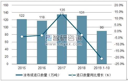 2015-2019年1-10月中國涂布紙進口數量及增速趨勢圖