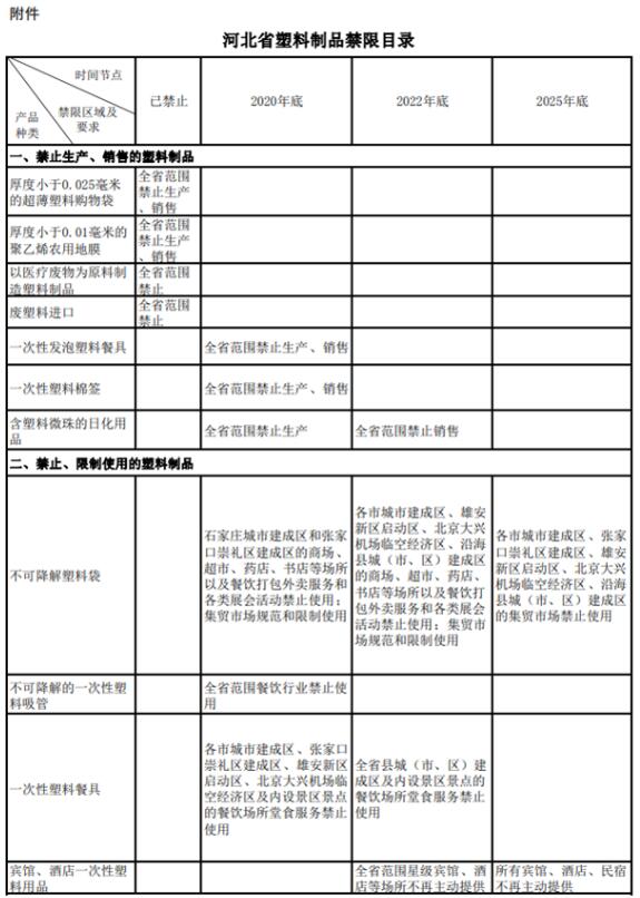 到2020年底,全省范圍餐飲行業禁止使用不可降解的一次性塑料吸管;各市城市建成區、張家口崇禮區建成區、雄安新區啟動區、北京大興機場臨空經濟區及內設景區景點的餐飲場所堂食服務,禁止使用不可降解的一次性塑料餐具。