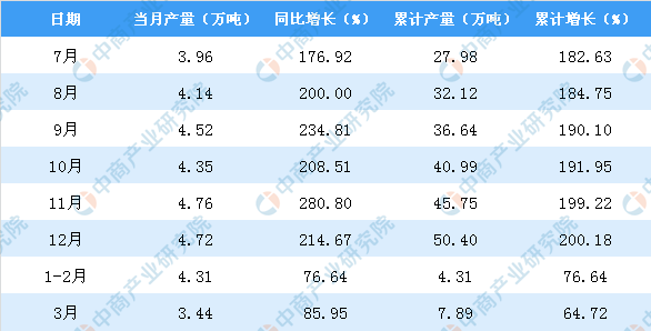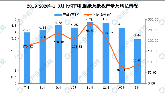 據中商產業研究院數據庫顯示,2020年1季度上海市機制紙及紙板產量增長,2020年3月上海市機制紙及紙板產量為3.44萬噸,同比增長85.95%。2020年1季度上海市機制紙及紙板產量為7.89萬噸,同比增長64.72%。