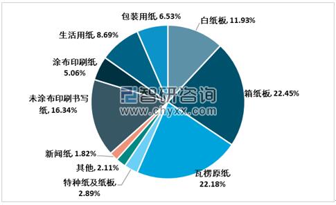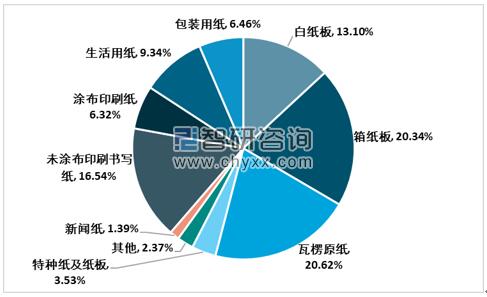 2019年國內紙及紙張細分產品生產有3個品種產量有所下降,整體保持良好的增長趨勢,其中瓦楞原紙、箱紙板、未涂布印刷書寫紙以及白板紙占據主要生產地位,其份額分別為20.62%、20.34%、16.54%以及13.1%。