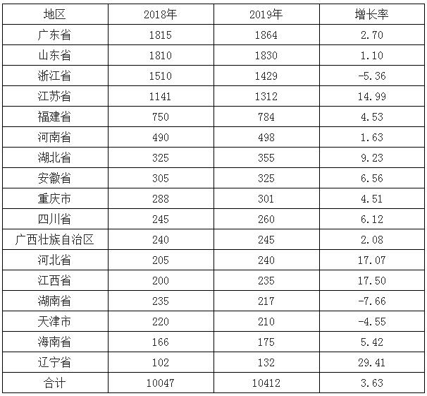 2019年廣東、山東、浙江、江蘇、福建、河南、湖北、安徽、重慶、四川、廣西、河北、江西、湖南、天津、海南和遼寧17個省(區、市)紙及紙板產量超過100萬噸,產量合計10412萬噸,占全國紙及紙板總產量的96.72%。