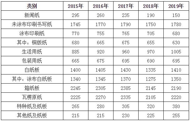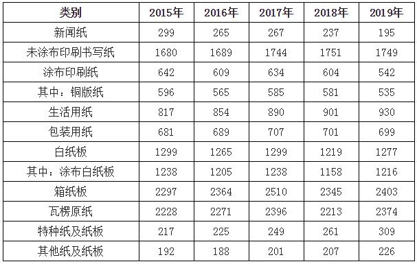 2019年新聞紙生產量150萬噸,較上年下降21.05%;未涂布印刷書寫紙生產量1780萬噸,較上年增長1.71%;涂布印刷紙生產量680萬噸,較上年下降3.55%;銅版紙生產量630萬噸,較上年下降3.82%;生活用紙生產量1005萬噸,較上年增長3.61%;包裝用紙生產量695萬噸,較上年增長0.72%;白紙板生產量1410萬噸,較上年增長5.62%;其中,涂布白紙板生產量1350萬噸,較上年增長5.88%。箱紙板生產量2190萬噸,較上年增長2.10%;瓦楞原紙生產量2220萬噸,較上年增長5.46%;特種紙及紙板生產量380萬噸,較上年增長18.75%。