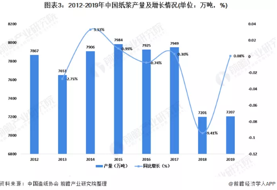 隨著我國經濟環境不斷改善,國家對可再生資源利用的不斷支持。我國紙漿生產也進入了新的階段,2012年以來,我國紙漿生產始終維持在7000萬噸以上,近期由于環保政策趨嚴,不符合標準的制漿企業逐步關停,導致我國紙漿產量有所下降。根據中國造紙協會統計數據顯示,2019年我國紙漿產量為7207萬噸,較2018年同比下降0.08%。