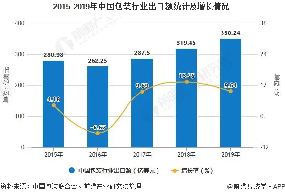 隨著我國對外貿易規模的不斷擴大,包裝行業出口市場也表現活躍。根據中國包裝聯合會發布的數據顯示,2016-2019年,我國包裝行業出口不斷增加。2019年行業實現總出口額350.24億美元,同比增長9.64%,繼續保持著強勁的增長勢頭。