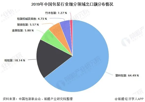 從細分領域出口情況來看,塑料包裝完成累計出口額225.86億美元,占比64.49%;紙包裝完成累計出口額63.54億美元,占比18.14%;金屬包裝完成累計出口額20.3億美元,占比5.8%;玻璃包裝完成累計出口額19.51億美元,占比5.57%;包裝機械及其他完成累計出口額16.55億美元,占比4.73%;竹木包裝完成累計出口額4.48億美元,占比1.28%。