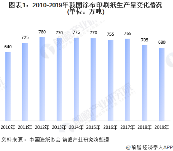 根據中國造紙協會在歷年《造紙工業年度報告》中披露的數據,2010-2019年我國涂布印刷紙的生產量整體上呈現先增長后下降的態勢。2019年,我國涂布印刷紙產量為680萬噸,較2018年下滑3.55%。