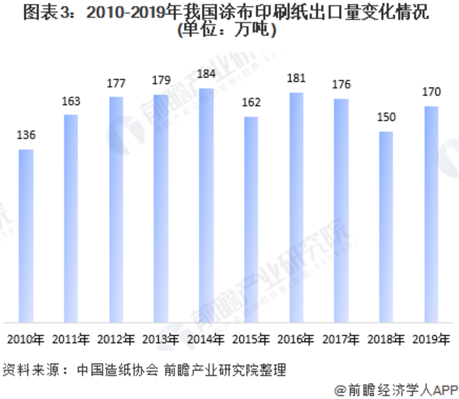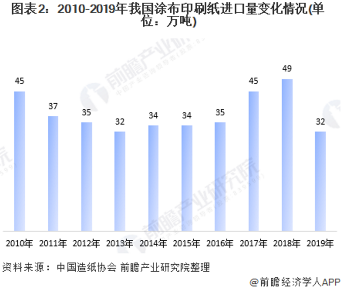 2010-2019年,我國涂布印刷紙進出口數量整體上呈現波動態勢,且出口量遠高于進口量。2019年,我國涂布印刷紙進口量為32萬噸,較2018年減少了17萬噸;出口量實現170萬噸,較2018年增長了20萬噸。